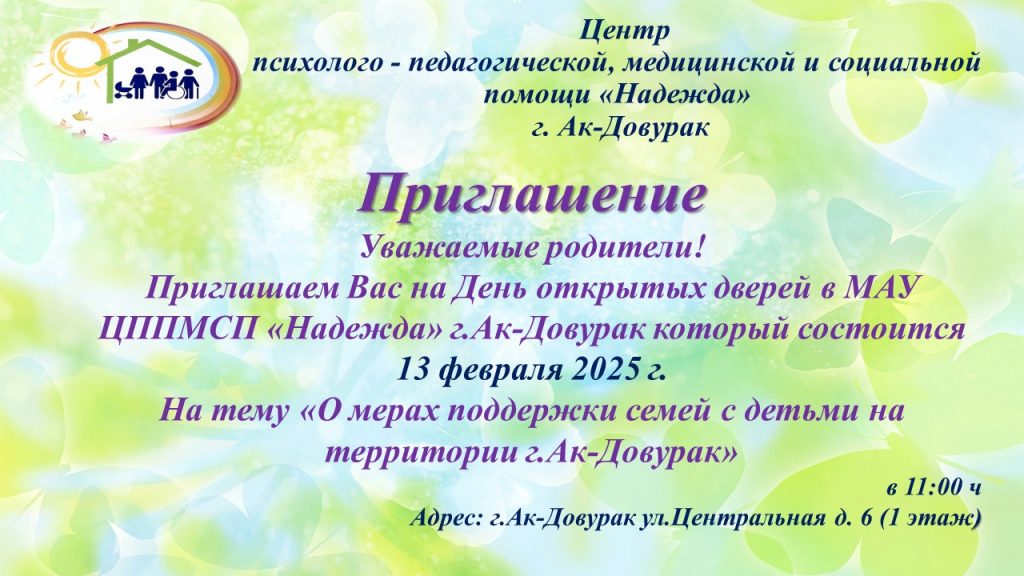 Без рубрики День открытых дверей 06.02.2025 / Уважаемые родители! Приглашаем Вас на День открытых дверей в МАУ ЦППМСП «Надежда» г.АК-Довурак на тему «О мерах поддержки семей с детьми на территории г.Ак-Довурак» который состоится 13 февраля 2025 г. в 11:00 ч.