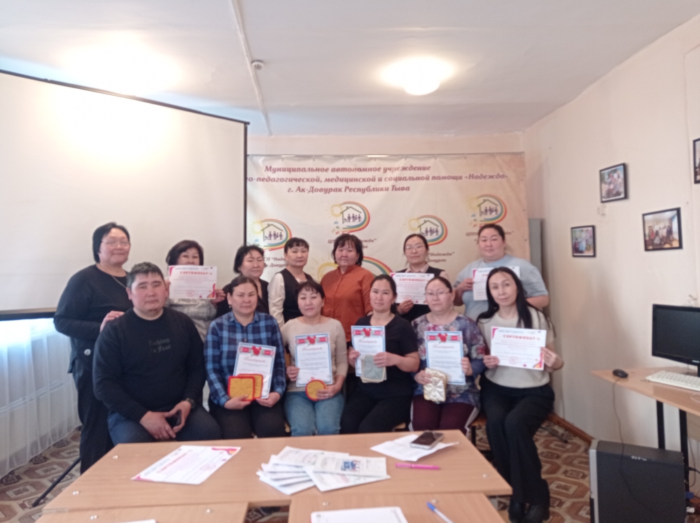 В конце выступлений, родителям (законным представителям), женщинам организовано мастер класс по шитью «Прихватка (туктууш)». Родителям очень понравился мастер класс некоторые даже научились сшить «Прихватка». В конце семинара выдан методистом У.О. Ооржак Р.И. сертификаты в объеме на 8 часов РОСДЕТЦЕНТРА, а также родителям принимавших участие в мастер классе присвоены грамоты от имени администрации Управления образования города Ак-Довурак, за активное участие.